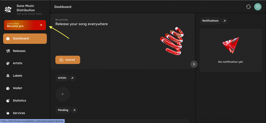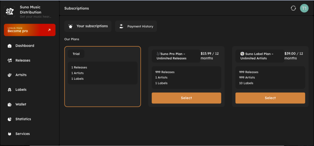 After logging in, select a SunoDistro plan based on your music release goals and requirements.